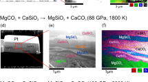 Processes removing carbon from the subducting slab include mechanical removal, and the devolatilisation, melting, and dissolution of carbonate minerals. Experimental studies20 and thermodynamic modeling21 indicate that only very little metamorphic devolatilization of carbonates takes place under subduction zone conditions. Furthermore, it has been shown that geotherms characteristic of subducting slabs intersect the melting curve of carbonated igneous oceanic crust at depths of 300–700 km, hence significantly reducing the stability region of carbonate minerals22. Therefore, carbonate dissolution in slab-derived fluids may become the dominant mechanism for carbon removal up to these depths. Carbonate dissolution has been reported in many different subduction environments. Near surface, authigenic carbonate is, for instance, deposited by serpentinite diapirs venting fluids23. With increasing depth (10–50 km), fluid–rock interaction results in the formation of fully carbonated peridotites composed of magnesite and quartz or dolomite and quartz, also known as listvenites24. Even deeper, high-pressure rocks preserve evidence for the carbonate dissolution. Ultrahigh-pressure rocks from the Italian western Alps or marbles from the Cycladic subduction complex on the Syros and Tinos islands, Greece, for instance, contain solid and fluid inclusions enriched in bicarbonate and carbonate ions and different carbonate minerals (calcite, magnesite, dolomite, and less common rhodochrosite)25,26. Carbonate O and C isotope systematics serve as additional evidence for carbonate dissolution accompanied by silicate precipitation26. Calcite, intermediate composition calcium–magnesium carbonate (Ca0.75Mg0.25CO3) (and the coexistence of each with ice VII), and dolomite inclusions in diamonds suggest the interaction region of water and carbonate minerals extends to at least transition zone depths14,27.