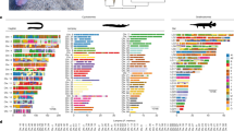 To distinguish between alternative polyploidization models (i.e. S5–S8 in Fig. 1), we followed ref. 13 and used a measure we have called multiplicity, i.e. the number of proto-cyclostome chromosomes originating from individual proto-vertebrate chromosomes (Fig. 3d), and counted the numbers of Japanese lamprey genes that map to these chromosomes. If the proto-cyclostome genome was shaped by three rounds of tetraploidization (S5 in Fig. 1), it should be covered by chromosomes of multiplicity eight. Instead, if it experienced a single tetraploidization with subsequent chromosomal duplications (S8 in Fig. 1), the multiplicity should peak at two with gradual decrease toward larger multiplicities. The third possibility is that if the genome went through a single tetraploidization and a hexaploidization (genome triplication) (S6 in Fig. 1) the majority of the genome should be covered by chromosomes of multiplicity six. Our analysis indicates that 9 out of the 18 proto-vertebrate chromosomes were duplicated into six paralogous proto-cyclostome chromosomes, and that the majority (60.3%) of the proto-cyclostome genome was covered by the sixfold duplicated chromosomes. In addition, we confirmed by statistical test (see ‘Methods') that the observed peak of multiplicity (Fig. 3d) is unlikely to have been created by accumulation of chromosome scale or segmental duplications after one (\(P\, < \, 4\times {10}^{-5}\)) or two (\(P\, < \, 0.05\)) tetraploidization events. Thus, the clear peak at multiplicity of six is compelling evidence of sixfold duplication of the entire genome, probably through a tetraploidization and a hexaploidization event.