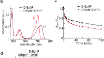 In the cyanobacterial phytochrome Cph130,31,32,33 and several bacteriophytochromes34,35, the dark-adapted Pr state exhibited higher kinase activity than the Pfr state. In particular, the Agp1 bacteriophytochrome from A. fabrum (also known as AtBphP1, based on the former species designation A. tumefaciens) displays histidine kinase activity in its resting Pr state28,36; in the Pfr state, the autophosphorylation and phosphotransfer reactions are downregulated by 2-fold and 10-fold, respectively28. The kinase activity of Agp1 has been shown to control bacterial conjugation37. Although DrBphP has been implicated in the control of carotene production21, no kinase activity has been demonstrated for DrBphP, notwithstanding close sequence homology and the elaborate structural changes this receptor undergoes under light24,29. Despite the eminent role of DrBphP as a paradigm for photoreception, the enzymatic activity and hence the exact physiological role of this model phytochrome have hence remained enigmatic.