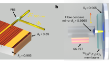 Since the inhomogeneous broadening of the memory crystal (0.7 GHz) is much larger than the hyperfine splittings, a preparation procedure is employed to isolate a well-defined four-level system in the memory crystal for implementing our NLPE protocol (Fig. 1b). This preparation procedure is not a part of NLPE protocol since it is not required if the inhomogeneous broadening is smaller than the hyperfine level splittings22 or working in the RF/MW regime. Four energy levels are involved in this protocol, where 1 denotes \({\left|\pm 1/2\right\rangle }_{{\rm{g}}}\), 3 denotes \({\left|\pm 3/2\right\rangle }_{{\rm{g}}}\), \(\bar{3}\) denotes \({\left|\pm 3/2\right\rangle }_{{\rm{e}}}\) and \(\bar{5}\) denotes \({\left|\pm 5/2\right\rangle }_{{\rm{e}}}\), respectively. Without causing confusion, we use fij to denote the frequency of light, which is resonant with \({\left|\pm i/2\right\rangle }_{{\rm{g}}}\leftrightarrow {\left|\pm j/2\right\rangle }_{{\rm{e}}}\) atomic transition. The first step is the so-called class cleaning process where four pump pulses with center frequencies of f15, f35, f13 and f53 are employed to select a single class of ions from memory crystal. The frequency of each pulse is swept over 5 MHz over 1 ms and these four pulses are repeated for 100 times. The second step is the so-called spin polarization process, where chirped pulses with center frequencies of f15 and f35 are applied to initialize these ions to the state \({\left|\pm 5/2\right\rangle }_{{\rm{g}}}\). Finally, an absorption structure on the \({\left|\pm 1/2\right\rangle }_{{\rm{g}}}\) state can be prepared by the backpump light with a center frequency of f53. To achieve high efficiency for the control pulses, here we limit the bandwidth of the back pump light to 700 kHz to prepare an isolated absorption peak inside a transparent spectral range on the \({\left|\pm\! 1/2\right\rangle }_{{\rm{g}}}\) state. Meanwhile, a chirped pulse at f35 is used to empty the \({\left|\pm 3/2\right\rangle }_{{\rm{g}}}\) state to be ready for spin-wave storage. In the preparation process, we also create a transparency window of ~1 MHz in the filter crystal, to transmit the signal at f15. The absorption depth of the memory crystal after spectral preparation is d = 0.6. The detailed structures are presented in Supplementary Fig. 1a in the Supplementary Information.