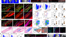 Statistical significance was assigned for P ≤ 0.05 (*P < 0.05 to ****P < 0.0001 represent a significant difference). Statistical analysis was performed using an unpaired student’s t-test with a two-tailed distribution and/or one-way analysis of variance (ANOVA). All statistical calculations were performed using the Prism 8 (GraphPad) software package. No statistical method was used to predetermine sample size. Figure panels show representative images of at least two independent experiments as indicated in the figure legend. Flow cytometry plots are representative of at least two individual experiments and up to ten. For all figures (n) indicate the number of animals used per each independent experiment, all experiments were performed at least three times unless otherwise indicated by the figure legend. For all figures data are presented as a percentage or absolute value. For all graphs data are presented as means or representative value with error bars representing ± the standard error.