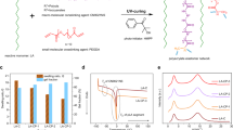 The average molecule weight of crosslinker should be in the range of 104 to 105 g mol−1, which matches the range of average molecular weight (\(\bar{{M}_{{{{{{\rm{c}}}}}}}}\)) between crosslinking points of polymer network (see “Methods” for selection of number average molecular weight). Considering the analysis discussed above, CN9021NS (\(\bar{{M}_{{{{{{\rm{n}}}}}}}}\) = 28000 g mol−1), a difunctional urethane acrylate compound composed of a flexible polyether diol segment and an aliphatic diisocyanate segment, was chosen as macromolecular crosslinker for the construction of n-butyl acrylic-based elastomer network (BAC). Herein, the dimension of crosslinkers match well with that of network mesh constructed by themselves. For comparison, n-butyl acrylate homopolymer (BA-S, BA-M and BA-L), crosslinked by the equimolar (taking BAC2 as reference) polyethylene glycol diacrylate (a small-molecular crosslinker, \(\bar{{M}_{{{{{{\rm{n}}}}}}}}\) = 575 g mol−1), CN9893NS (a medium molecular crosslinker, \(\bar{{M}_{{{{{{\rm{n}}}}}}}}\) = 1600 g mol−1) and CN9014NS (a large molecular crosslinker, \(\bar{{M}_{{{{{{\rm{n}}}}}}}}\) = 6800 g mol−1), respectively, was also prepared through a similar polymerization process.