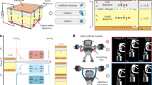 The output torque and power of motors mainly depend on the Maxwell pressure, strain, and mechanical loss of elastomers. The Maxwell pressure on the elastomer film scales linearly with dielectric constant and quadratically with the applied electric field while the strain is defined as the ratio of Maxwell pressure and Young’s modulus28. Due to the significant improvement of dielectric constant, mechanical loss, and actuation performances as discussed above, the output torque and power of BAC2 based motor are distinctly improved (Fig. 4d). The output torque and power are 6 times and 18 times larger than those of VHBTM4910 based motor, respectively. The fabrication process and characterization of these soft motors are displayed in the “Methods” section in detail.