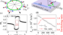 As observed in previous numerical studies33,34,35,53, the deterministic switching starts with the nucleation of a domain at the edge of the sample because of the magnetization tilting toward an in-plane direction imposed by the DMI boundary conditions (see Fig. 5a). In other words, the nucleation of a new domain at the edge is driven by the SOT applied to this in-plane component at the edge (Fig. 5c–e). The switching occurs via a strongly nonuniform magnetization pattern, given by the higher DW velocity in the edges as compared to the central region due to the combined effects of the DMI boundary conditions, the DMI, and exchange fields (Fig. 5f–h). After the current is switched off, the magnetization relaxes to the reversed uniform ground state (Fig. 5i–j). The same process is observed for the current pulses of opposite polarity (see Fig. S7 in Supplementary Note S7). To consider a more realistic memory device geometry, we also implemented similar simulations for a pillar with a diameter of 400 nm (see Fig. S8 in Supplementary Note S7). The main conclusions about the switching process are not affected when considering this pillar geometry.