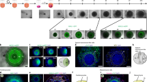 Our method is designed to meet four initial milestones: (1) high organoid quality and reproducibility; (2) high-throughput/high-content format; (3) relative simplicity (no need for special equipment outside of traditional cell culture instrumentation); (4) defined chemical conditions for maximum control and versatility for downstream applications. We started by assembling hPSCs into embryoid bodies (EBs) by centrifugation in ultra-low attachment 96-well plates followed by a 48-h incubation at 37 °C and 5% CO2 prior to induction (Fig. 1a). After induction, two-thirds of the spent medium was removed and replaced with fresh medium at each medium change, resulting in gradual transitions in exposure to the different signals employed and minimizing agitation of the organoids at the bottom of the well. Induction of mesoderm and cardiogenic mesoderm was achieved by sequential exposure to CHIR99021, a canonical Wnt pathway activator (via specific GSK3 inhibition), and Wnt-C59, a Wnt pathway inhibitor (via PORCN inhibition) (Fig. 1a), in a modification of previously described protocols14,21,22. Brightfield and immunofluorescence imaging of hHOs showed a significant increase in size throughout the differentiation protocol (Fig. 1b). Confocal microscopy for the cardiomyocyte-specific marker TNNT2 showed that organoids developed sarcomeres as early as day 7 (Fig. 1b), with much clearer sarcomere banding and fiber assembly by day 15 (Fig. 1c). Beating hHOs appeared as early as day 6 of the differentiation protocol, with robust and regular beating by day 10 in all organoids and lasting for at least 8 weeks in culture (Supplementary Movies 1–3, corresponding to the longest time tested). We found out that optimal conditions for the first Wnt activation were critical for successful heart organoid formation and differed from those reported for cardiac lineage monolayer differentiation. We exposed EBs to different concentrations of CHIR99021 (1 µM, 2 µM, 4 µM, 6.6 µM, and 8 µM) on day 0 for 24 h and then evaluated hHOs for cardiac lineage formation by confocal microscopy at day 15 of differentiation (Supplementary Fig. 1a). Optimal cardiogenic mesoderm induction for all human embryonic stem cell (hESC) and induced pluripotent stem cell (hiPSC) lines was found at 1–4 μM CHIR99021 concentrations, rather than the typical 10–12 µM range reported for monolayer methods14,21,22,23,24,25,26,27. 4 µM CHIR99021 exposure resulted in the highest cardiomyocyte content with 64.9 ± 5.3% TNNT2 + cells at day 15 (Fig. 1d, Supplementary Fig. 1a). We believe enhanced differentiation at lower CHIR concentrations can be attributed to endogenous morphogen production due to the self-assembling conditions provided28,29,30,31,32. Time-course RNA sequencing analysis between days 0 and 19 of differentiation supports this hypothesis by revealing the stepwise production of fundamental cardiac development morphogens and growth factors and their respective receptors (Suppl. Fig. 1b). hHOs treated with 4 µM CHIR99021 also displayed the best functional properties out of all tested concentrations (Suppl. Fig. 1c, d). Our hHO differentiation protocol was reproducible across multiple hPSC lines (iPSC-L1, AICS-37-TNNI1-mEGFP, iPSCORE_16_3, H9), all of which exhibited similar differentiation efficiencies, beat metrics, growth rates, and sizes (Fig. 1e, f).