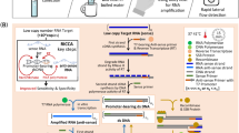 The NISDA assay was developed for the N gene and its performance was further studied. The sensitivity analysis was carried out using serial dilutions of synthetic SARS-CoV-2 RNA (TWIST Bioscience) in Nuclease-free water and spiked in known negative oropharyngeal RNA extracts (provided by clinical microbiology department, Hvidovre Hospital, Denmark). Figure 5a and b illustrates the NISDA assay response to different concentrations of SARS-CoV-2 RNA diluted in water and negative matrix, respectively. The ultrafast response of the assay is evidential as the fluorescence intensity could dramatically reach to its maximum value within the first minutes of the reaction. Considering the plots of fluorescence enhancement slope as the function of RNA concentration, the semi-quantitative behavior of the assay can be comprehended. Although, sudden enhancement of the fluorescence signals resulting from rapid amplification makes it difficult to accurately define the slopes thereby calculating the LoD. As a result, in order to calculate the sensitivity of our assay, we performed a quantification study based on the endpoint fluorescence readings (tables in Fig. 5a, b). The cutoff value was defined as 95% of confidence interval (i.e., the mean value of the signals obtained from the negative samples plus two times of their standard deviation (mean + 2 SD)12, and the lowest concentration of the SARS-CoV-2 RNA that showed a greater signal than the cutoff value was defined as the LoD. Therefore, the LoD of NISDA assay was five and ten copies µL−1 of SARS-CoV-2 RNA diluted in water and negative matrix, respectively (one copy µL−1 corresponds to five copies per reaction). In addition, the developed NISDA assay did not show any false-negative result. Moreover, no cross-reactivity was observed for the NISDA assay (prepared for SARS-CoV-2) tested on other various respiratory viral nucleic acids of human coronaviruses 229E (H CoV 229E), influenza A virus subtype H1N1 and H3N2, Boca virus 1, H enterovirus 68, H rhinovirus 89, and Mumps (Fig. 5c, d).