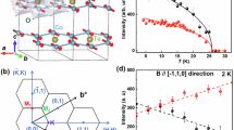 We interpret our magnetization data heuristically as follows18. Between 7.5 and 10.5 T, the system is in a spin-disordered state with short-range spin correlations. On the one hand, the short-range spin correlations increase the dM/dB intensity with increasing temperatures since these thermal fluctuations thermally activate the spins that can be flipped by the magnetic field. On the other hand, the increasing temperature thermalizes the already polarized spins to decrease the dM/dB intensity. Therefore, the temperature-independent dM/dB intensity below 6 K and 7.5 T < B < 10.5 T indicates there exist strong short-range spin correlations for such low temperatures in the spin disordered state. Above 6 K and 7.5 T < B < 10.5 T, the thermal fluctuations quickly thermalize the already polarized spins so that the dM/dB intensity decreases with increasing temperature. By contrast, the system crosses over to the polarized state above 10.5 T. Thus, the temperature-independent dM/dB intensity at 10.5 T reflects a characteristic field at which these two competing effects compensate each other. We, therefore, take 10.5 T as the crossover field from the correlated spin-disordered state to the spin-polarized state. The magnetization curve further suggests that the saturation field for the B ⊥ b-axis case is around BS = 12.5 T with saturation magnetization MS = 2.01μB/Co2+ obtained by subtracting off the Van-Vleck paramagnetic contribution49 (Fig. 2c).