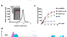 The ATPase activity of these mutants was also analysed, using plasma membrane vesicles (Supplementary Fig. 8). Pdr5-enriched plasma membranes were selected over purified protein to ensure retention of native lipid environment. To account for differences in expression level or effective membrane insertion, Coomassie-stained SDS-PAGE (Supplementary Fig. 8a) was analysed by densitometry. To enable direct comparison, signal intensity of Pma1 (Plasma membrane ATPase 1) was used as internal control. Based on this analysis, the difference between the expression of Pdr5 wild-type and the mutants was below 10%, and thus it was not taken into account in the quantitative analysis of the ATPase activity (Supplementary Fig. 8b). Supplementary Table 4 summarises the statistical analysis of the kinetic parameters. Whilst KM values of the wild-type and the mutants were not significantly different, the Vmax values of all mutants except I805S were highly significantly (p < 0.0001) decreased. This suggests that the highly conserved MQKGEIL motif not only senses the nucleotide in the degenerated NBS1, but is also involved in communication with the active NBS1. This scenario is reminiscent of the case of converting the degenerate site of Pdr5 into an active site that completely abolished ATPase activity13. Furthermore, it highlights that Pdr5 is an uncoupled transporter, and that even at the reduced Vmax value, it is still capable of conferring drug resistance.