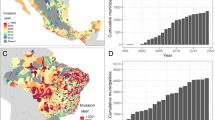 where PPPd is purchasing power parity in department d (a feature not included in the dynamic model)65. This input is an economic index that was intended to serve as a proxy for spatial variation in conditions that could affect exposure to mosquito biting, such as housing quality or air conditioning use6. Given that this formulation of \({\bar{R}}_{d}\) was informed by data from outbreaks of Zika and chikungunya prior to the Zika epidemic in Colombia, we did not estimate its underlying parameters over the course of the epidemic in Colombia.