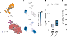 CD8 + T cells from samples treated with ICI transiently exhibited higher levels of genes associated with effector function and IFN-γ signaling relative to untreated samples, which were more naïve-like. Principal component analysis revealed that the first two principal components distinguished early post-treatment (<30 days since initial treatment) and pre-treatment samples (Supplementary Fig. 6). Loadings for these principal components were driven by genes associated with IFN-γ signaling as well as effector/naïve phenotypes of CD8 + T cells25,26,27. Indeed, we detected a significant increase in genes related to effector-like function and IFN-γ signaling (Fig. 2e, f; gene lists in Supplementary Data 5) in CD8 + T cells in recently treated (<30 days since initial treatment) samples vs. pre-treatment in both NCT02886585 (Cohen’s d = 0.91 and 0.65, p < 0.001 for both IFN-γ and effector/naïve signatures respectively) and NCT02939300 (Cohen’s d = 0.75 and 1.07, p < 0.001 for both IFN-γ and effector/naïve signatures, N = 6,133 CD8 + T cells). Furthermore, we found that the mean level of IFN-γ signaling in the T cells was strongly correlated with the mean IFN-γ response in tumor cells at the same time points (Kendall’s τ correlation = 0.67, p = 0.003, Fig. 2g), suggesting that inflammatory response is consistent across cell types in the same CSF sample.