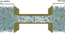 AIMD simulations were performed using the Quickstep module implemented in the CP2K package58. Ion–valence electron interactions were represented by Goedecker–Teter–Hutter (GTH) pseudopotentials66,67. The GTH-valence double-zeta-polarized Gaussian basis combined with a plane-wave basis set (with an energy cutoff of 280 Ry) was selected for the AIMD simulations. The Gaussian and augmented plane wave (GAPW) scheme was applied to obtain well-converged forces for the Na+ ion47,68. The BLYP exchange–correlation functional was used together with the Grimme dispersion correction (D3)69. A time step of 0.5 fs was used to ensure sufficient energy conservation for highly confined water systems. The temperature was maintained at 300 K in constant-temperature and constant-volume (NVT) AIMD simulations.