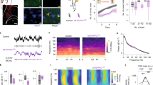 Synaptic strength, along with the neuron’s intrinsic excitability, is a plastic property of cells that can be regulated/modulated when a micro-environmental change alters a neuronal circuit. To directly address the functional consequences of selective NG2 glia photoactivation on neuronal synaptic activity, miniature inhibitory postsynaptic currents (mIPSCs) and miniature excitatory postsynaptic currents (mEPSCs) were recorded using whole-cell patch-clamp separately from both hippocampal interneurons and CA1 pyramidal neurons in Pdgfrα-creERTM; ChR2-eYFP transgenic mice, in the presence of tetrodotoxin (TTX) to block the AP-evoked synaptic transmission. As the cartoon and images presented in Fig. 2a, b, and e show, one interneuron and one pyramidal neuron loaded with a fluorescent dye Alexa Fluor 568 in the patch pipette were easily identified in the hippocampal CA1 region based on their anatomical locations, distinct morphologies, as well as firing properties31,32. In the presence of 20 µM DNQX, 50 µM AP5 and 1 µM TTX to block glutamatergic as well as AP-evoked synaptic transmission, we found that the frequency of mIPSCs of interneurons was significantly enhanced in 27 out of 40 randomly recorded cells without affecting the amplitude nor the dynamics of mIPSCs after NG2 glia photostimulation (15 Hz, 90 sec) (Fig. 2b, c, Kolmogorov–Smirnov two-sample test). The average frequency and amplitude of mIPSCs in a total of 40 interneurons were: 1.64 ± 0.13 Hz pre- vs. 2.18 ± 0.16 Hz post-NG2 glia photoactivation (P < 0.0001, n = 40 cells, two-tailed Wilcoxon-matched pairs test); 35.50 ± 1.55 (-pA) pre- vs. 36.92 ± 1.63 (-pA) post-NG2 glia photoactivation (P = 0.1206, n = 40 cells, two-tailed Wilcoxon-matched pairs test, Fig. 2d and Supplementary Fig. 3), respectively. However, neither frequency nor amplitude of mIPSCs showed significant changes in 95% of recorded pyramidal neurons after NG2 glia photoactivation (38 out of 40 cells, Fig. 2e, f, Kolmogorov–Smirnov two-sample test). The average frequency and amplitude of mIPSCs in a total of 40 pyramidal neurons were: 2.04 ± 0.19 Hz pre- vs. 2.04 ± 0.19 Hz post-NG2 glia photoactivation (P = 0.9839, n = 40 cells, two-tailed Wilcoxon-matched pairs test); 33.94 ± 1.48 (-pA) pre- vs. 34.89 ± 1.47 (-pA) post-NG2 glia photoactivation (P = 0.0748, n = 40 cells, two-tailed paired t test, Fig. 2g) before and after NG2 glia photoactivation, respectively. A recent study showed that optogenetic depolarization of mature oligodendrocytes facilitates hippocampal pyramidal neurons’ excitatory synaptic responses33. To exclude that the synaptic effect might be caused by a small population of ChR2-expressing oligodendrocytes (6.93 ± 1.62% from 3 mice) shown in our immunohistochemistry analysis (Supplementary Fig. 1), we recorded mEPSCs using whole-cell patch-clamp in both pyramidal neurons and interneurons of hippocampal CA1 region. In the presence of 20 µM bicuculline and 1 µM TTX, we found that neither interneurons’ nor pyramidal neurons’ mEPSCs were altered after NG2 glia photoactivation (Supplementary Fig. 4, n = 12 and 11 for interneurons and pyramidal neurons, respectively), indicating no or non-measurable effects from photostimulated oligodendrocytes.