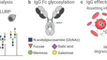 Acquired immunity mediated by PfEMP1-specific IgG is generally thought to rely on its ability to interfere directly with IE sequestration (i.e., neutralizing, adhesion-inhibitory antibodies). However, antibody-mediated opsonization of IEs is a likely additional effector function of these antibodies, since the antibody response to most P. falciparum asexual blood-stage antigens (including PfEMP1) is completely dominated by the cytophilic subclasses IgG1 and (to a lesser extent) IgG3 (refs. 24,25). Nevertheless, the relative importance of neutralization and opsonization remains largely unexplored. Complement-mediated destruction of IgG-coated IEs does not seem important26, suggesting that IgG opsonization of IEs by IgG functions mainly through IgG-Fc receptor (FcγR)-dependent phagocytosis and antibody-dependent cellular cytotoxicity (ADCC)27,28,29. The latter involves FcγRIIIa30. Binding of IgG to FcγRIIIa critically depends on the composition of a highly conserved N-linked glycan at position 297 in the Fc region31. Different monosaccharides, such as galactose, fucose, and sialic acids, are added to the bi-antennary core structure of the Fc glycan (Fig. 1c). The level of fucosylation is of particular significance, since afucosylated IgG has up to 20-fold increased affinity for FcγRIIIa32. The reason is believed to be a steric clash between a unique N-linked glycan at position N162, not found in FcγRIa nor FcγRIIa/b, and the bi-antennary glycan in the IgG-Fc imposed by the core-fucose32. Even more strikingly, IgG-afucosylation can convert a non-functional ADCC potential to strong and clinically significant responses33,34,35,36. Increased galactosylation at N297 can further enhance affinity to FcγRIII by additional twofold, and also increases the complement activating capacity of the antibody. In contrast, no influence of bisecting N-acetylglucosamine (GlcNAc) on antibody effector functions has been demonstrated so far35.