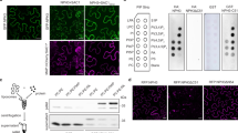 To confirm these results in stable transgenic lines, Arabidopsis nph3 mutants were transformed with NPH3::GFP-NPH3 containing the R18 or mR18 sequences. Confocal imaging of hypocotyl cells of etiolated seedlings revealed similar patterns of localisation observed in N. benthamiana, with GFP-NPH3-R18 forming aggregates in darkness, whereas GFP-NPH3-mR18 failed to relocalise following repeated laser scanning (Fig. 7c). Consistent with the subcellular localisation patterns, analysis of NPH3 dephosphorylation showed that lines expressing GFP-NPH3-mR18 display no change in electrophoretic mobility following blue light treatment, whereas a portion of GFP-NPH3-R18 exhibited enhanced electrophoretic mobility both in darkness and after irradiation (Fig. 7d). Far-western blotting was used to confirm the constitutive binding of recombinant 14-3-3 Epsilon to GFP-NPH3-R18 immunoprecipitated from seedlings maintained in darkness and following blue light irradiation, as well as the absence of 14-3-3 binding to GFP-NPH3-mR18 (Fig. 7e). Together, these results show that engineered 14-3-3 binding, independent from phot1-mediated S744 phosphorylation, is partially sufficient to induce changes in NPH3 dephosphorylation and localisation status.
