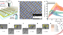 Over the course of the experiment, the acoustic field’s excitation frequency was modulated from 20–100 kHz while maintaining an applied power of 1–25 V peak-to-peak (VPP). When exposed to such an acoustic field, the ciliary band oscillate in-phase and undergoes small-amplitude oscillations (see Supplementary Fig. 4 and Supplementary Movie 1). These oscillations result in a time-averaged steady flow field in the surrounding liquid, also referred to as acoustic streaming14. This acoustic streaming is driven by the dissipation of acoustic energy flux inside the fluid system that occurs, in general, both within and outside of the viscous boundary layer. However, for devices where the characteristic dimensions are much smaller compared to the acoustic wavelength (L ≪ λ), the acoustic streaming is primarily driven by the viscous dissipations within the boundary layer15,16. For the cilia system considered in this work, the thickness of the viscous boundary layer can be computed as \(\delta =\sqrt{\nu /(\pi f)}=\; \sim\! 1.8-4.0\upmu {{{{{\rm{m}}}}}}\), where \(\nu \approx {10}^{-6}\,{{{{{{\rm{m}}}}}}}^{2}/{{{{{\rm{s}}}}}}\) is the kinematic viscosity of water at room temperature, and f = 20–100 kHz is the excitation frequency. The viscous dissipations in this thin boundary layer drive the outer bulk streaming motion. This streaming profile is determined by the arrangement of the ciliary array relative to the normal axis of the underlying bulk surface. Referring to Fig. 1a insets, a + ciliary band comprises a pair of ciliary arrays that face each other and causes the liquid to flow away on a plane perpendicular to the center of the ciliary band, analogous to a fluid source. Conversely, a − ciliary band consists of two ciliary arrays oriented away from each other and directs the streamlines of the liquid flow to the center of the band, analogous to a fluid sink. Fig. 1b represents the complex flow profile of a bioinspired microrobot by combining + and − ciliary bands.
