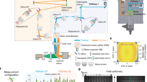 The laser beam was split into four distinct beam paths by using three ultrafast laser beam splitters (10RQ00UB.4, Newport). The first beam path was relayed directly to the rest of the microscope after splitting. For each subsequent beam an additional ~2.4 m of path length was inserted to achieve an 8 ns inter-pulse interval between each beam when combined at the objective. Each beam’s diameter was adjusted by using pairs of achromatic lenses (AC254 lenses of various focal lengths, Thorlabs) to apply the necessary magnification to ensure an 8 mm beam diameter going into the FPUs. Half-wave plates (AHWP10M-980, Thorlabs) installed in motorized rotation mounts (PRM1/MZ8, Thorlabs) were positioned prior to each FPU to adjust the polarization of each beam. These half-wave plates, in combination with a polarizing beam splitter positioned prior to the tube lens, controlled the power level of each individual beam arriving at the sample. The FPU’s were mounted on XY stages (8MTF-102LS05, Standa) to enable movement of the imaging region in the sample plane in X and Y. In each FPU a focus tunable lens (EL-16-40-TC) was conjugated to a resonance scanner (SC30-10×9-6-6, Electro-Optical Products Corp.) by a relay lens (AC254-100-B-ML, Thorlabs) and scan lens (S4LFT0089/094, Sill Optics GmbH). Positioning the focus tunable lenses in this way ensures that no changes in magnification occur when varying the depth of imaging. Between the relay lens and scan lens, a fold mirror (MRA10-M01, Thorlabs) was used to reflect the light vertically into the scan engine which translates FPU movement in X and Y to an angular tilt of the beam onto the resonance scanner. The resonance scanner performed fast axis scanning in the sample plane and was conjugated to a 2D beam steering mirror (OIM5010, Optics in Motion LLC) used for slow axis scanning and overall X and Y positioning of the imaging regions of interest. Conjugation between the resonance scanner and 2D mirror was achieved by a pair of scan lenses (S4LFT0089/094, Sill Optics GmbH). The 2D mirror was conjugated to the back pupil plane of the objective by a custom designed scan lens and tube lens (Supplementary Fig. 2). The custom scan lens and tube lens were designed to achieve diffraction limited RMS wavefront error across the entire 4.8 mm FOV using any combination of FPU and 2D mirror beam steering at 920 nm and 1040 nm when the ETL was focused at 0 µm offset. Field curvature performance was not optimized. Between the scan lens and tube lens a custom polarizing beam splitter was used to combine the beams from the two separate scan engines. The polarizing beam splitter also rejects any unwanted excess power from any of the four beams controlling the amount of excitation power reaching the sample. The custom objective18, scan lens, polarizing beam splitter, and tube lens were all manufactured by Rocky Mountain Instrument Co. Between the tube lens and objective, a large mirror (84-438, Edmund Optics) was used to reflect light down through a long-pass dichroic (Cold Light Mirror KS 93/45°, Qioptiq) and into the objective.