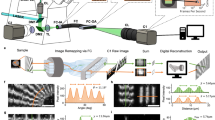 For direct observation, via a 20 × 0.5 NA objective (Olympus), the Convallaria sample (slice labeled with Fast Green and Safranin, Leica) (Fig. 2a–d) was excited at 485 nm with emission separated via a 488 nm dichromatic filter (Semrock 488 nm Brightline long pass) to capture the complete emission spectrum. An image was captured using a 500 µs pixel exposure time and the complete set of 512 spectral and 16 time channels (the time channels were used in “chained mode” whereby two channels are “chained” together to allow increased dynamic range21, see reference for more detail) were passed to the PC for processing where color information was processed as described in the main text. Lifetime values were calculated by using a rapid least-squares fitting algorithm, implemented using the open-source GPUfit library25 in Matlab 2019b (Mathworks).