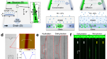 This intriguing wave propagation is considered to occur according to the following mechanism. First, when CO2 is allowed to penetrate from the slightly opened screw cap inlet into the interior of the cuvette, ions such as HCO3−, CO32−, and H3O+ are produced in the aqueous TiNS dispersion, generating an ion gradient that progressively attenuates the electrostatic repulsion between TiNSs36,37. Consequently, the van der Waals attraction between TiNSs prevails, thereby reducing the TiNS distance (Fig. 1b and Supplementary Fig. 3). Indeed, during the wave propagation, the TiNS distance gradually contracted from 420 to 350 nm in 20 h, as confirmed by a microscopic reflection spectral trace (Supplementary Fig. 7). The reason why such contraction results in forming the wave can be theoretically explained by considering the deformation of an elastic lamellar structure, which is known as the Helfrich–Hurault instability (Supplementary Method 6)27,28,29,30,31,32,33. This theoretical calculation indicates that the TiNS planes align along the sinusoidal curves in Fig. 2d. The POM image of this calculated wave, simulated using the Jones matrix method (Supplementary Fig. 8a)40, coincides well with the experimentally observed one (Supplementary Fig. 8b), thereby supporting the wave formation mechanism described above. The Helfrich–Hurault instability27,28,29,30,31,32,33 and other types of instabilities41 were sometimes observed in liquid crystalline systems of mesogenic molecules. Such instabilities are usually induced by physical stimuli, such as electric and magnetic fields, temperature, light, and mechanical forces, whereas the present propagating wave was induced by a chemical stimulus. The key requirements for generating a macroscopic wave are that (1) the cofacial TiNS assembly must adopt a monodomain with a single crystal-like structural integrity and (2) constituent TiNSs must be strongly correlated with each other. In fact, no wave was detected without prior magnetic orientation of TiNSs into the monodomain geometry (Supplementary Fig. 9a). The same held true when the correlation of TiNSs was weakened by dilution (Supplementary Fig. 9b) or solvent exchange (ethylene glycol/water [75:25, v/v]; Supplementary Fig. 9c). The threshold contraction of the TiNS distance for wave formation was determined to 3.7% by microscopic spectroscopy measurements (Supplementary Fig. 10), while the bending elastic modulus \(K\) was estimated to be ~1.1 pN by dynamic light scattering (DLS; Supplementary Fig. 11)27.