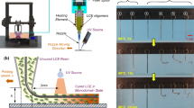 Liquid crystalline oligomers were synthesized via a base-catalyzed thiol-Michael click-reaction, described in detail elsewhere15. Briefly, BHT (radical-inhibitor, 0.300āg, 1.36āmmol), RM257 (diacrylate mesogenic monomer, 30.00āg, 49.7āmmol) and HHMP (UV-radical photoinitiator, 0.415āg, 1.85āmmol) were added to a glass vial and melted together in a water bath set at 70ā°C. The melted components were thoroughly mixed, and bubbles/dissolved gases removed via vacuum before EDDT (dithiol spacer monomer, 8.30āg, 43.2āmmol) and PMDETA (base catalyst, 0.20āg, 1.17āmmol) were added and the mixture again mixed and degassed. The mixture was then transferred to the DIW-printing barrels and left in an oven set at 70ā°C for half an hour to start the Michael addition (Supplementary Fig. 3). The barrel was then left at ambient temperature and protected from light for 2 days before printing. The chosen ratio of RM257:EDDT (1.000:0.870) ensured oligomers were acrylate capped and therefore would undergo crosslinking during 3D printing.