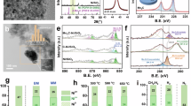 As shown in Fig. 5a, the γ-Mo2N support is highly porous, and the supported nanoparticles were well dispersed on the surface of the γ-Mo2N at 400 °C in the simulated activation atmosphere. The corresponding BF and ADF-STEM did not show useful information since the support is too thick (Supplementary Fig. 6). On the SE images, the supported nanoparticles showed an irregular polygon shape (~5–7 nm) with clear edge (Fig. 5). No significant morphology change was observed with the time evolution at 400 °C (Fig. 5a, b). The detailed analysis of the fast Fourier transformation (FFT) of SE and BF images of the Ni-4nm/γ-Mo2N at 400 °C were shown in Fig. 6a, b. Due to the penetration depth differences of secondary electron and traditional electron probes, the FFT patterns of SE and STEM reflect the structural information of the near surface species and the bulk of the sample respectively. As shown in the Fig. 6a, the region 1 shows a typical pattern of FCC structured γ-Mo2N with a d-spacing ~2.0 Å, which is the bare support. While region 2 is confirmed unexpectedly as Ni4N particles (d-spacing 2.6 Å, Supplementary Fig. 7) rather than the metallic Ni. This phenomenon suggested that the formation of Ni–N bonding changes the bulk structure of loaded Ni species. While the FFT of the BF image at region I is identical to the SE one, confirming the bulk phase of region 1 is the substrate. In contrast the features of both γ-Mo2N and Ni4N could be seen at region II in the FFT of STEM images, demonstrating the bulk of the catalyst below region II is composed by both the Ni4N particles and the nitride support. These results also demonstrate that the loaded Ni particles are 3D particles with considerable thickness at 400 °C. With the elevated activation temperature, the supported nanoparticles on the surface begins to fade, or even disappear. The SE images of 520 °C (Fig. 5d, g, h) proves that the pores in the γ-Mo2N substrate have disappeared, probably been covered by the loaded species, indicating the Ni has formed raft-like clusters and spread over the support (Supplementary Movie 9). The FFT patterns of SE and STEM (Fig. 6c, d) further confirmed the thermal induced redispersion phenomenon. The SE FFT pattern at region III showed a typical Ni4N features with d-spacing ~2.5 Å, suggesting the surface of region 3 is still covered by the Ni species. However, the STEM FFT pattern at the same region only showed features belong to γ-Mo2N, which demonstrates that the Ni particle is possibly too thin to generate diffraction patterns. Compared with the electron diffraction patterns collected at 400 °C, we could confirm that the Ni particles have been spread into 2D layers on the nitride substrate under the thermal treatment. The normalized intensity profiles of the 520 °C sample’s surface were much weaker than those of the 400 and 500 °C samples (Supplementary Fig. 8), which is another evidence that the Ni particles have reverse sintering at high temperature. The EDS mapping on STEM of ex-situ samples of Ni-4nm/γ-Mo2N-590 catalysts were also carried out to further confirm the spontaneous dispersion of Ni NPs on the γ-Mo2N (Supplementary Fig. 9).
