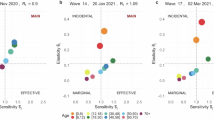 We define daily effective contacts as model predicted daily contacts in the estimated mixing matrix rescaled so that the number of daily effective contacts in the 20–29 years old (y.o.) is 7.7, as observed in the SocialCov survey (Supplementary Fig. 2). We estimate that the number of effective contacts in the rebound period starting on 9 July was highest in individuals aged 20–29 yr (Fig. 2B and Supplementary Figs. 2 and 3). As a comparison, the number of effective contacts in those aged 10–19 yr, 50–59 yr, and ≥80 yr was, respectively, 5.9 (5.3–6.5), 4.5 (3.9–5.2), and 2.9 (2.4–3.4), corresponding to 0.76 (0.69–0.84), 0.59 (0.51–0.68), and 0.38 (0.31–0.45) times the number of effective contacts in individuals aged 20–29 yr. These estimates are consistent with the number of daily contacts measured in different age groups by the online survey SocialCov (30 July–27 September 2020) (see Supplementary information)17, but for two key differences (Fig. 2B). First, we estimated that the number of effective contacts for transmission in children aged 0–9 yr was substantially lower than the reported number of contacts in the survey. This reflects the limited contribution of younger children (0–9 y.o.) to SARS-CoV-2 transmission during this time period and is consistent with either a lower susceptibility to SARS-CoV-2 infection or a reduced infectivity compared to older individuals18,19,20,21. Second, the contribution to transmission of all other age groups relative to those aged 20–29 yr is between 17% and 37% lower than what might be expected from the contact survey. Again, this might be explained by reduced risks of transmission given contact compared to 20–29 y.o., for example, thanks to better compliance with the use of masks or physical distancing. These differences highlight the distinction between raw contacts measured from contact surveys and effective contacts that we estimate and that capture different risks of transmission given contact. Our estimated mixing patterns can reproduce the observed rises in positivity rates (Fig. 2C, E and Supplementary Figs. 4 and 5) and hospital admissions by age group (Fig. 2D, F and Supplementary Figs. 4 and 6).
