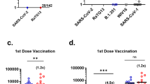 It has been shown that the RBD of SARS-CoV-2 S shows higher homology to the corresponding region of the pangolin CoV S protein or the recently discovered BANAL-20-52 isolate from Rhinolophus malayanus in Laos than to RaTG135,6,36. Whether or not this is a consequence of recombination or convergent evolution is under debate37,38. Notably, both BANAL-20-52 and Pan CoV S protein contain a positively charged residue at position 403 and are capable of utilizing human ACE2 for infection (Fig. 6a, b)36. It was suggested BANAL-20-52 is closer relative to SARS-CoV-2 than RaTG13, indicating that a change in residue 403 may have occurred before the emergence of this strain. Altogether our results suggest that a positively charged amino acid residue at position 403 in the S protein was a prerequisite for efficient zoonotic transmission and pandemic spread of SARS-CoV-2. Notably, a positively charged residue at the corresponding position is present in S proteins of most RaTG13-related bat coronaviruses (Supplementary Fig. 7). Thus, many bat sarbecoviruses, including the unknown precursor of SARS-CoV-2, may be fitter for zoonotic transmission than RaTG13. However, our preliminary data suggest that vaccination might protect us against such close bat relatives of SARS-CoV-2.