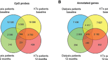 The association of the 69 eGFR-associated and validated CpGs from the general population with eGFR in the German Chronic Kidney Disease (GCKD) study was evaluated after correcting for the number of evaluated sites, and statistical significance was defined as P-value < 7.2E−4 (0.05/69). The GCKD study is a prospective observational study of patients with CKD63. Briefly, 5217 adult patients under nephrological care provided written informed consent and were enrolled from 2010 to 2012. Inclusion criteria were eGFR between 30 and 60 ml min−1 per 1.73 m2 or an eGFR of >60 ml min−1 per 1.73 m2 with UACR > 300 mg g−1 (or a urinary protein–creatinine ratio of >500 mg g−1). Follow-up of the patients for clinical endpoints is still ongoing. Study endpoints are continuously recorded in a standardized fashion based on hospital discharge letters and death certificates, and include kidney-related events as well as death. Study design and the recruited study population are described in more detail in previous publications63,64. The GCKD Study was approved by local ethic committees and registered in the national registry for clinical studies (DRKS 00003971). A subset of 559 patients with CKD attributed to systemic lupus erythematosus, membranous nephropathy, focal-segmental glomerulosclerosis or autosomal-dominant polycystic kidney disease was selected for DNA methylation quantification and measured using the Infinium MethylationEPIC BeadChip array (EPIC). Association with eGFR was evaluated analogously to the main analysis (see Statistical methods and meta-analysis), apart from adjustment for smoking which was coded 0/1/2 for never-/ex-/current-smoker. To evaluate the association of DNA methylation with time to kidney failure from study entry, Cox regression models were fitted for each CpG, and analogously for a combined endpoint of kidney failure and acute kidney injury. Besides the DNA methylation predictor, models were adjusted for age, sex, and CKD subtype. The Cox regression model provides estimates for cause-specific hazard ratio (HR) in the presence of the competing events, i.e., any other death except kidney-related death. Subdistribution hazard analyses were additionally carried out in order to evaluate potential indirect effects via the competing event. The proportional hazards assumption was assessed based on scaled Schoenfeld residuals. Graphical assessment for the two associated CpGs revealed no evidence of major violations (Supplementary Fig. 9).