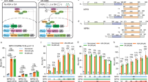 Quantitative measurement of GUS activity was performed according to the protocol described by Jefferson et al.57. Plant samples were ground with liquid nitrogen and then homogenized in extraction buffer (50 mM NaHPO4, pH 7.0, 10 mM beta-mercaptoethanol, 10 mM EDTA, 0.1% sodium lauryl sarcosine, 0.1% Triton X-100). The homogenate was centrifuged at 20,000g for 10 min at 4 °C. The supernatant was collected and assayed by fluorometric quantitation of 4-methylumbelliferone produced from the glucuronide precursor using a multiplate reader (365-nm excitation filter and 455-nm emission filter; Mithras LB940; Berthold Technologies).