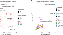Multiple random ROIs were scored for each patient sample. Analyses were performed using Python(v3.8.2) on the cell-segmented output from the HALO software and all mIHC analysis plots were created using the matplotlib (v3.2.1) package. Statistical tests were performed using the scipy (v1.3.2), numpy (v1.18.5), pandas (v1.0.5) and statsmodels (v0.11.1) packages. Populations proximal or distal from “central cell” markers (TIM-3+ or SARS-CoV-2 NP+ in this paper) were determined by calculating a distance matrix between the centroids of each central cell to every other cell and identifying those cells <15 μm from a central cell (except the central cell itself) as proximal and all other cells as distal. ROIs from the same sample were combined by summation of proximal and distal cell counts. ROIs without central cells were disregarded. Odds ratios were aggregated to derive aggregated odds ratios and confidence intervals using Cochran-Mantel-Haenszel and Breslow-Day procedures as implemented by the Stratified Table class of the statsmodels module using default values. Comparison of cell percentages between sexes in Fig. 2d and Supplementary Fig. 2e were performed by averaging of cell percentages across all ROIs of each patient, followed by taking the average of those percentages in men and dividing by the average of those percentages in women, and transforming the resulting by log2. Odds ratios defined as (N(x)NP+/N(y)NP+)/(N(x)NP−/N(y)NP−), where (x) and (y) refer to two cell types compared to each other. When the odds ratio is close to 1, both cell types are as likely to be NP+ in Fig. 4d