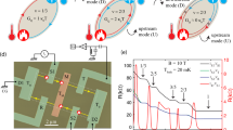 where kB is the Boltzmann constant, T is the temperature, R is the resistance of the QH state, G is the gain of the amplifier chain, and BW is the bandwidth. The first term, 4kBTR, corresponds to the thermal noise, and \({V}_{n}^{2}\) and \({i}_{n}^{2}\) are the intrinsic voltage and current noise of the amplifier. At finite bias, the upstream mode carries heat from the hot spot to the noise spot near the amplifier contact. This leads to the enhancement of stochastic inter-mode tunneling processes in the noise-spot region, which creates an excess noise, see below for detail. At the same time, the intrinsic noise of the amplifier remains unchanged. Frequency independence of the thermal noise and the excess noise allows us to operate at a higher frequency (~763 kHz) so that we can eliminate the contribution from flicker noise (1/f) which usually becomes negligible for frequency above a few tens of Hz. The excess noise (δSV) due to bias current is obtained by subtracting the noise value at zero bias from the noise at finite bias, i.e δSV = SV(I) − SV(I = 0). The excess voltage noise δSV is converted to excess current noise SI according to \({S}_{I}=\frac{\delta {S}_{V}}{{R}^{2}}\), where \(R=\frac{h}{\nu {e}^{2}}\) is the resistance of the considered QH edge.