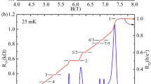 For our measurements, we have used two dual graphite gated hexagonal-boron-nitride (hBN)-encapsulated bilayer graphene devices, which are fabricated using the standard dry transfer pickup technique, see the Method section and Supplementary Information (SI), section S1. To observe, at modest magnetic fields, well-developed FQH states, which are highly susceptible to disorder (below ν < 1), screening layers are required. The presence of the top graphite gate serves that purpose and improves the quality of the device43. The device schematic is shown in Fig. 1c. The zero-magnetic-field gate response of the devices is shown in SI (S1). From this data, the mobility of the devices is extracted and found to be ~1.7 × 105cm2V−1s−1 and ~3 × 105cm2V−1s−1 for devices 1 and 2, respectively. First, we perform electrical conductance measurements at a fixed magnetic field of 10 T using standard lock-in amplifier. The electron density is tuned by the back graphite gate, keeping the top graphite gate fixed at zero voltage. The measured transverse Hall resistance (Rxy) and longitudinal resistance (Rxx) of device-1 are shown in Fig. 1d for ν ≤ 1. Clear plateaus in Rxy are developed for ν = 1, ν = 2/3, and ν = 1/3, accompanied with zeroes in Rxx for ν = 1 and ν = 2/3, and a very low (in comparison to h/e2) resistance of 30 − 40Ω for ν = 1/3. Similarly, plateaus are seen in Rxy for ν = 1, ν = 2/3, ν = 3/5 and ν = 1/3 for device-2, see SI (S10), where Rxx reaches zero for ν = 1, ν = 2/3 and ν = 1/3, and ~200 Ω for ν = 3/5.