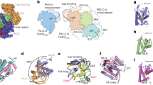 The most complete structure (class 1), representing ~15% of the particles, shows an almost completely ordered polymerase heterotrimer with only the C-terminal nuclear localisation signal (NLS) domain of PB2 remaining unresolved (Fig. 1a). The overall conformation of the polymerase is similar to the previously observed conformations implicated in transcription although with some differences in the exact location and orientation of the C-terminal domains of PB2, comprising the mid, cap-binding, linker (which together with mid forms a rigid-body domain mid-link), 627 and NLS domains7,15,16. Specifically, the cap-binding domain is rotated by ~90° relative to the polymerase core with the cap-binding site facing away from the product exit/primer entry channel (Supplementary Fig. 4a). This conformation of the cap-binding domain is stabilised through a correlated rotation of the 627 domain by 26°. The co-rotation of these domains leads to a new interaction between the 424 loop of the cap-binding domain and residues 585–588, 624 and 625 of the 627 domain, instead of the previously observed interaction of the 424 loop with PB1 residues7,15,17. However, the overall fold of the 627-domain remains the same as observed in previous structures.