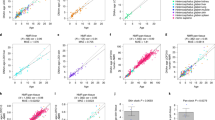 The NMR blood clock is based on a linear model of 26 CpG sites (Supplementary Data 4). The predicted age is calculated as the weighted average of methylation levels of the 26 CpG sites (‘clock sites’) plus 3.133 years (the intercept). All clock sites correlated with age and one another, most prominently the neighboring CpGs (Fig. 2c). The most negatively correlated and positively correlated clock sites showed r = −0.7 (p = 4.4e-17) and r = 0.73 (p = 2e-19), respectively (Fig. 2d). All 26 clock sites showed significant changes in DNAm levels with age, with different patterns of age-related changes (Supplementary Fig. 3).