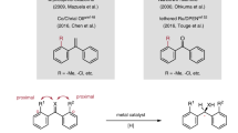 The Andersson group has earlier developed a selectivity model to rationalize the stereochemical outcome of hydrogenations of trisubstituted olefins and iridium-N,P complexes21,22,23. Calculations have suggested that the coordination of an unfunctionalized olefin towards an [IrH2(N,P)(Solvent)2]+ complex takes place in the same equatorial plane as the chiral bidentate N,P-ligand and trans to phosphorus (Fig. 3a). The resultant quadrant model rationalizes whether the steric bulk of the ligand is above or below the N-Ir-P plane (Fig. 3b). To minimize steric interactions, the substrate then preferentially coordinates with the smallest olefin substituent, in this case the vinylic proton, to the hindered environment and thus coordinates by one of the enantiotopic faces in favor. This mode of coordination is supported by computational findings of other research groups using different iridium complexes24,25,26,27. Most important, experimental support for this hypothetical coordination was reported by an elegant low-temperature NMR study of Pfaltz in which a fundamental intermediate, an IrIII dihydride alkene complex akin to the above-described, was identified28. Intriguingly, although the model correctly predicts the stereochemical outcome for most olefins, it cannot be used for the hydrogenation of olefins having a conjugated carbonyl group29,30. Whereas the correct absolute configuration can be predicted for the formation of β-disubstituted carbonyl compounds, hydrogenation of α-disubstituted unsaturated carbonyl compounds yield the opposite enantiomer compared to the prediction (Fig. 3c).