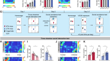 Next, we investigated how VTADA neurons are engaged during the exploration of innately anxiogenic environments in freely moving mice. C57BL/6 mice were infused with AAV2/9-DIO-GCaMP6s and AAV2/9-TH-Cre into the VTA, and optic-fiber cannula was implanted over the same site. After a week’s rest, 10-day of CES modeling was conducted, followed by EPM test and simultaneous VTADA neuronal activity detection using position-synchronized in vivo calcium imaging (Fig. 2l, m). CES mice showed decreased exploring time in the open arms and increased time in the closed arms of EPM (Fig. 2n, o). Meanwhile, CES mice exhibited a significantly higher average Ca2+ activities and higher variation rate of Ca2+ fluorescence in the VTADA neurons during open-arm exploration, but not closed-arm exploration (Fig. 2p–s). We also tested whether VTADA neurons are engaged during the SIT. Compared with control mice, CES mice showed no significant differences in time in the interaction zone, average Ca2+ activities, and variation rate of Ca2+ fluorescence (Fig. 2t–x). Similarly, employing the same strategy in DAT-Cre mice, we also found that the VTADA neurons of DAT-Cre mice showed significant activation of GCaMP6s activity in anxiety-inducing contexts (Supplementary Fig. 5a–m), which is in agreement with our above studies. Together, these results indicate that the activation of VTADA neurons by CES is involved in the anxiety-like behavior in the innate anxiogenic environment, but does not directly affect mice’s social interaction behavior.