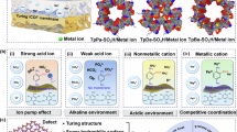 Proton conduction is an essential property of iCOFMs. IEC, thickness, crystallinity, and ion conduction channel continuity of iCOFMs play a decisive role in the proton conductivity. In this study, the membrane thickness, crystallinity, and channel continuity can be adjusted by changing the addition amount of monomer activators. As shown in Fig. 4a, with the increasing amount of n-octanoic acid in the organic phase, the thickness of membrane loose layer increased, while the thickness of the dense layer remained almost unchanged (~3 μm, Supplementary Fig. 15). This phenomenon can be explained by the membrane growth mechanism. With the increase of the n-octanoic acid addition amount, more aldehyde monomers were activated and the initial interface polymerization rate became higher, leading to the formation of more non-continuous COF particles and, accordingly, the increase of the thickness of the membrane loose layer. As the n-octanoic acid addition amount increased from 5 to 15 mL, the 100 characteristic peak intensity was enhanced (Fig. 4b) and the proton conductivity of the membrane increased from 0.33 to 0.66 S cm−1. The enhanced proton conductivity was attributed to the ordered and continuous ionic channels formed in the highly crystalline TpBD-(SO3H)2 iCOFMs, which can effectively facilitate the proton transport3. However, the proton conductivity decreased from 0.66 to 0.13 S cm−1 with the increase of n-octanoic acid amount from 15 to 20 mL (Fig. 4c). This was due to the increased thickness of the low-conductive loose layer of the TpBD-(SO3H)2 iCOFMs, within which the ionic channels were less continuous. Similarly, the membrane thickness increased with the increase of sodium formate addition amount (Fig. 4d). With low sodium formate addition amount (0.5–1eq), the resultant TpBD-(SO3H)2 iCOFMs was relatively thin (~0.2–2 μm), due to the low interfacial polymerization rate. In this case, the mechanical strength of the TpBD-(SO3H)2 iCOFMs was insufficient for the proton conduction test. When the addition amount of sodium formate increased from 0.5 to 2.5 eq, the crystallinity of the TpBD-(SO3H)2 iCOFMs was enhanced (Fig. 4e). However, when the addition amount of sodium formate further increased from 2.5 to 3.5 eq, the characteristic peak intensity turned lower. This was because the excessive interfacial polymerization rate will lead to rapid formation of low-crystalline COF particles. Accordingly, the crystallinity of the loose layer became lowered. Similar phenomena have also been observed in previous studies31,44. When the addition amount of sodium formate was 1.5 eq and the resultant TpBD-(SO3H)2 iCOFMs possessed a thinner loose layer and high crystallinity. Under this optimized condition, the resultant TpBD-(SO3H)2 iCOFMs exhibited superior proton conductivity (0.66 S cm−1 at 90 °C and 100% relative humidity (RH), Fig. 4f), which was remarkably higher than those of reported COF-based proton-conducting materials, and was nine-fold higher than the commercial Nafion 212 membrane3 (Supplementary Tables 8 and 9). We further performed the temperature-dependent conductivity measurements, as shown in Fig. 4g. Even at 30 °C, 100% RH, the proton conductivity of the resultant TpBD-(SO3H)2 iCOFMs reached 0.24 S cm−1, on par with the proton conductivity of Nafion 117 at 80 °C, 100% RH3. Furthermore, we fabricated previously reported iCOFMs (TpPa-SO3H, NUS-9, IEC: 3.2 mmol g−1) from aldehyde monomer Tp and ionic amine monomer 2,5-diaminobenzenesulfonic acid (Pa-SO3H) using the same method. Dual-activation condition could afford high crystalline TpPa-SO3H iCOFMs within 24 h (Supplementary Figs. 19–26). The proton conductivity of the resultant TpPa-SO3H iCOFMs reached 0.2 S cm−1 at 90 °C, 100% RH (Supplementary Fig. 26), lower than that of the TpBD-(SO3H)2 iCOFMs. The superior proton conductivity performance of the TpBD-(SO3H)2 iCOFMs can be explained as follows: Unlike amorphous polyelectrolyte membrane, the rigid framework structure with high density of –SO3H groups endowed the TpBD-(SO3H)2 iCOFMs with superhigh IEC of 4.6 mmol g−1, Fig. 4h), while maintaining a low swelling ratio (Supplementary Table 7). The ultra-high density of monodispersed sulfonic acid groups along the one-dimensional proton-conducting channels within the membrane will lead to a shorter proton hop distance based on surface transport mechanism45,46. Moreover, owing to the higher IEC, the TpBD-(SO3H)2 iCOFMs could absorb more water molecules (Supplementary Figs. 7 and 25), which play a critical role in proton transport based on Grotthuss and vehicle mechanisms47. Accordingly, the TpBD-(SO3H)2 iCOFMs afforded low energy barrier paths (Ea = 0.15 eV, Fig. 4i) for proton transport.