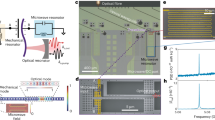 The vacuum optomechanical coupling rate g0 of individual modes was determined via noise calibration49. To that end, the thermo-mechanical spectrum is measured at low cooperativity (\({{{{{{{\mathcal{C}}}}}}}}={\bar{n}}_{{{{{{{{\rm{cav}}}}}}}}}\frac{4{g}_{0}^{2}}{{{{\Gamma }}}_{{{{{{{{\rm{m}}}}}}}}}\kappa }\approx 6.9\times 1{0}^{-3}\), where Γm is the mechanical damping rate and \({\bar{n}}_{{{{{{{{\rm{cav}}}}}}}}}\) is the average number of photons in the cavity), so that effects due to dynamical backaction can be neglected. A reference signal generated by a phase modulator is added close to the mechanical modes to calibrate the spectrum. The modulation depth ϕ0 = πV0/Vπ (where V0 is the amplitude of the radio-frequency voltage applied to the modulator and Vπ is the half-wave voltage) at frequency \({{{\Omega }}}_{{{{{{{{\rm{mod}}}}}}}}}\) is determined from the first sideband ratio (see Supplementary Note 11). The vacuum optomechanical coupling rate is then calculated as49