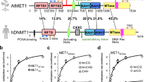 DNA methylation at the C-5 position of cytosine residues is a conserved epigenetic modification involved in transposon silencing, genome stability, and regulation of gene expression in many eukaryotes1,2,3,4,5,6,7,8,9,10,11,12,13. In plants, DNA methylation occurs in three sequence contexts: CG, CHG, and CHH, where H is any nucleotide except G. Plants have evolved different DNA methyltransferases for the establishment and maintenance of DNA methylation depending on the cytosine sequence contexts13,14. CG methylation is maintained by METHYLTRANSFERASE 1 (MET1), an orthologue of the mammalian DNA methyltransferase 1 (DNMT1), which recognizes hemi-methylated CG dinucleotides following DNA replication and methylates the unmodified cytosine in te daughter strand15,16. Maintenance of CHG methylation is catalyzed by CHROMOMETHYLASE 3 (CMT3) and, to a lesser extent, by CMT2 and is tightly linked to dimethylation of lysine 9 on histone 3 (H3K9me2)17,18,19. The asymmetric CHH methylation is maintained by two different types of DNA methyltransferases, CMT2 and DOMAINS REARRANGED METHYLTRANSFERASE 1/2 (DRM1/2, homologs of DNMT3), depending on the genomic regions: CHH methylation in heterochromatin is maintained by CMT2, whereas CHH methylation in euchromatin or at the edge of long transposable elements (TEs) is mediated by DRM1/2 through the RNA-directed DNA methylation (RdDM) pathway20,21,22,23,24. RdDM is also important for de novo DNA methylation in all three sequence contexts1,2,21,23,25,26,27,28. Even though the roles of these five DNA methyltransferases have been extensively studied, whether they are sufficient to maintain DNA methylation throughout the entire genome or, on the contrary, the contribution of other yet-to-be-described DNA methyltransferases is required, is unresolved.