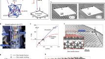 By applying compressive load while simultaneously observing real-time deformation patterns using X-ray micro-CT, both rational movements and crack propagation in the material were examined and shown in Fig. 3a–c. The micro-CT examination revealed that, before joint rotation, cracks are first initiated around the side of the scaffold with a thinner cover of hard shell, which was also confirmed in extended finite element method (XFEM) simulations (Supplementary Fig. 4). Next, the cracks propagated vertically into the thinner cover, which led to material spalling around the joint (Fig. 3a). After spalling occurred, the more flexible scaffold joint started to compress, leading the topmost segment to rotate towards the scaffold (counter-clockwise in Fig. 3c). As the rotation continued, the thicker hard shell on the other side changed from compression to tension. Then, a horizontal crack formed that separated the first segment from the second (Fig. 3b, c). In addition, we also found the material in the top of the rotating segments was also being subjected to intensified fractures that contributed to greater energy absorbance (Supplementary Fig. 5). In the assembly structure, the asymmetric rotation was also found to be axisymmetric around the centre column of the scaffold where the three U-shapes connected with each other at 120-degree angles. A schematic showing the rotation mechanism of the segments in the assembled honeycombed material is presented in Fig. 3d and a corresponding discrete element method simulation of the failure of the first tier after loading is shown in Fig. 3e.