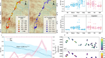 δ18Ow values were calculated for each sample using Δ47-derived SLST estimates, measured δ18Oc, and a published calibration48 (Fig. 3f). Reconstructed lake water δ18Ow has a mean value of −4.3 ± 1.8‰ from 4.3 to 2.7 Ma, and decreased to −7.4 ± 2.6‰ at 2.7–2.6 M that partly overlaps with the value of local modern meteoric waters (−11.9 to −7.7‰)25 (Fig. 3f). Evaporative enrichment of 18O in a closed lake system results in elevated δ18Ow values19. The decrease in lake water δ18Ow value at the KP site at 2.7–2.6 Ma may be associated with reduced evaporation in this region.