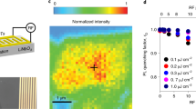 Figure 1b depicts the scenario when a bilayer WSe2 is under both optical pumping and SAW modulation. Since the bilayer WSe2 is inversion symmetric, there are two energy degenerate IXs with dipole moment p pointing along the +z and −z directions, respectively. For simplicity, hereon, we use +z IX to explain the transport process. The electric field E(r,t) induced by the SAW modulates the IX energy by \(\varDelta U=-p\cdot E\) and thus creates a dynamic potential well moving at the acoustic velocity. At low temperatures, the optically excited IXs will quickly relax to the energy minimum created by the SAW in real space and travel with the propagating SAW. Figure 1c shows the optical image of our device. We designed a focusing IDT structure that focuses the acoustic wave into the WSe2 region (Fig. 1d) to concentrate the acoustic power density and enhance the piezoelectric field E. The IDT excites a strong SAW mode at 1.237 GHz with an acoustic wavelength of 2.832 µm, assuming an acoustic velocity of 3.5 × 103 m/s for the z-propagating Rayleigh mode in a y-cut LiNbO3 substrate (see S.I). Figure 1d shows the simulated electric field profile of the focused beam of the acoustic wave, which at the focal point has a waist of ~3.0 µm. To reduce the inhomogeneous broadening and exciton trapping from spatial variation of surface potential, we encapsulated the bilayer WSe2 with ~10 nm hexagonal boron nitride (h-BN) flakes using the standard pick-up method and transferred onto the LiNbO3 substrate with pre-patterned IDTs40. A thin layer of indium-tin-oxide (ITO) was deposited on the heterostructure region as a top transparent electrode. This top electrode plays an important role by efficiently suppressing the in-plane piezoelectric field component (Ex), which may cause exciton dissociation14,41,42,43, while maintaining a relatively strong out-of-plane field component Ez. The finite-element method (FEM) simulation (Fig. 1e, f) compares the piezoelectric fields in the situations of with (Fig. 1e) and without (Fig. 1f) the top ITO layer, showing that the ITO layer suppresses Ex by about two orders of magnitude.