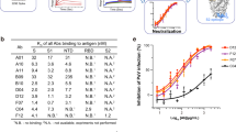 There are two PDCoV RBD interacting regions on APN (Fig. 2a, b). The first region involves the contact between DII of APN (α2 helix, α5 helix, and α6–α7 loop) and β1–β2 hairpin of PDCoV RBD (Fig. 3a). The ε-amino group of K379 on APN forms a network of hydrogen bond/salt bridge interactions with D317, F318, and E320 on PDCoV RBD (Fig. 3a). Our surface plasmon resonance (SPR) results show that K379A mutation on hAPN results in a more than 100-fold decrease of affinity (from 10−6 M to 10−4 M) to PDCoV RBD (Fig. 3b, Fig. 4a, b, Supplementary Table 2), while corresponding K374A mutation in pAPN abolishes its binding to PDCoV RBD (Fig. 3b, Fig. 4c, d, Supplementary Table 2). E426 and W429 on APN form a salt bridge and hydrogen bonding with R322 and E320 on PDCoV RBD, respectively (Fig. 3a). Accordingly, E426A and W429A mutations on hAPN, or respective E421A and W424A mutations on pAPN, cause 3-100 fold reduction of affinity (Fig. 3b, Fig. 4e–h, Supplementary Table 2). Additional interaction in this region involves the packing of Y316 on APN against F318 on PDCoV RBD (Fig. 3a) and disruption of this interaction also lead to a 10-fold decrease in affinity (Fig. 3b, Fig. 4i, Supplementary Table 2). The second PDCoV RBD APN binding region mainly consists of the interactions between β5 and β6 hairpin of PDCoV RBD and DIV of APN (α19–α20 loop and α21–α22 loop). Residues on α19–α20 loop (R741–E742–I743–P744–E745) of APN make extensive contacts with residues on β5–β6 loop, β6 strand of PDCoV RBD (N397–Y398–L399–L400–R401), via hydrogen bonding and salt bridge (Fig. 3c, e). Most of the hydrogen bonds involve the main chain of residues on APN or RBD and therefore would be less dependent on the specific sequence of residues. Therefore, for residues that participate in hydrogen bonding, we only mutated those whose side chains were hydrogen donors or acceptors. E742A mutation on APN breaks the E742–R357 salt bridge (Fig. 3c) and leads to a 4-fold decrease in affinity (Fig. 3b, Fig. 4j, Supplementary Table 2). H789 on α21–α22 loop of APN is hydrogen-bonded with Y398 on PDCoV RBD as well (Fig. 3c). H789A and another mutation E745A only cause a slight decrease in affinity (Fig. 3b, Fig. 4k, l, Supplementary Table 2). Additionally, W396 on β5–β6 loop contacts L372 on DII of APN via hydrogen bonding (Fig. 3a). Interestingly, PDCoV RBD shows ~10-fold lower affinity to pAPN than to hAPN (Fig. 3b, d, Fig. 4a, c, Supplementary Table 2). Reciprocally, mutation of PDCoV RBD residues F318, E320, R322, R357, and Y398 also lead to 5- to 150-fold decrease in affinity to pAPN or hAPN (Fig. 3d, Supplementary Fig. 3a–h, Supplementary Fig. 4a–h, Supplementary Table 3). W396 alone accounts for 15% of the total buried surface area on PDCoV RBD and mutation of this residue abolishes the binding of PDCoV RBD to either hAPN or pAPN (Fig. 3d). Collectively, by using structure-guided mutagenesis, we have identified key residues that mediate the binding between PDCoV RBD and APN.