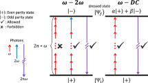 Figure 4a–c show the measured harmonic amplitudes of spectral components n = 18.8, 19.75, and 20.7 as a function of the waveplate angle, \(\theta\), obtained by integrating the measured signal (Fig. 3c) in a range of \(n{\omega }_{0}\pm 0.0225{\omega }_{0}\) and taking the square root. Each harmonic amplitude curve was fitted to three models of the form \(\left|{a}_{m}{\left(\theta -{\theta }_{0}\right)}^{m}\right|\), for \(m={{{{\mathrm{1,2,3}}}}}\) (a constant term was allowed for initially allowed harmonics). The obtained \({R}^{2}\) values of these fits are summarized in the table in Fig. 4d. The formula and \({R}^{2}\) values of the best fit to each harmonic amplitude, as well as overlays of the numerical fits over the measured harmonic amplitudes, are shown in Fig. 3a–c. Comparing the obtained \({R}^{2}\) values in Fig. 4d with the predicted scaling (Fig. 3f), we observe that fits to the predicted lowest order allowed contributions resulted with \({R}^{2} \, > \, 0.95\) for all the six examined cases, while all other fits were significantly smaller. These results demonstrate the experimental observation of selection rules by real-synthetic DS, which could consequently be used for applications.