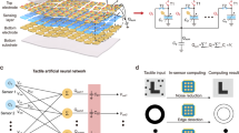 Our sensor exhibits high stability under cyclic loading-unloading. We tested the signal stability of the sensor (10 mm × 20 mm in area) under rubbing and shear conditions, each for at least 10,000 cycles. Figure 3g, h show that when the sensor is rubbed with abrasive paper for 100,000 cycles under a normal pressure of 10 kPa and a reciprocating displacement of 2 mm, no obvious change in signal waveform or amplitude is observed. By contrast, the sensing signal of a commercial flexible pressure sensor is apparently unstable (Supplementary Fig. 21). We also tested the signal stability by applying repeated shear stress of 5 kPa (Fig. 3i and Supplementary Fig. 22) for 10,000 cycles, and likewise no significant change in signal amplitude or mechanical failure was observed. By contrast, control samples with a non-bonded microstructured interface show clear signal drift (low panels, Fig. 3i).