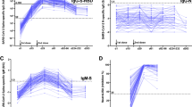 Levels of IgM, IgG, and IgA against SARS-CoV-2 spike (S) protein receptor-binding domain (RBD) were measured using a nationally validated in-house ELISA-based assay as described elsewhere with minor modifications29. Briefly, 1 µg/ml of recombinant (r) RBD produced in-house was coated onto Nunc-Maxisorp 384-well plates (464718; Thermo Fisher Scientific) in PBS overnight (ON) at 4 °C. Plates were blocked with PBS and 0.05% Tween (Merck) (PBS-T) for 1 h. Subsequently, diluted serum samples were applied in dilution buffer and incubated for 1 h. Antibodies were detected by adding 0.5 µg/ml HRP-conjugated polyclonal rabbit anti-IgM, IgG, or IgA (P0215, P0214, and P0216, respectively, all from Agilent Technologies) and incubated for 1 h. Plates were developed for 7 min (IgG) or 10 min (IgM, IgA) using TMB-One (4380A, Kem-En-Tec) as a substrate. The reaction was stopped using 0.3 M H2SO4. A mixture containing equal concentrations of r-human IgM, IgG, and IgA antibodies against S protein/RBD was used as a calibrator (1:2000 dilution; A02046-100, A02038-100, and A02071-100, respectively, all from Genscript). The optical density (OD) was measured using a Synergy HT absorbance reader (Biotek Instruments) at 450–630 nm. Between steps, the plates were washed with PBS-T four times. All incubation steps were performed at room temperature (RT) shaking. The threshold for assay positivity was set to 200, 225, and 100 AU/ml for IgM, IgG, and IgA, respectively.