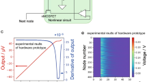 where Vo(t) and Vi(t) denote the input and output voltages, respectively. The saturation current Is and thermal voltage VT stem from the Shockley diode equation \(I={I}_{s}({e}^{\frac{{V}_{D}}{{V}_{T}}}-1)\). The typical values for germanium diodes Is = 25 × 10−9 A and VT = 0.026 V were used in the simulation. In the case of linear neurons, the last term \(\frac{1}{{C}_{{int}}}{I}_{s}({e}^{-\frac{{V}_{o}\left(t\right)}{{V}_{T}}}-1)\) should be removed from Eq. (9).