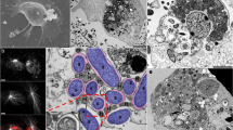 Due to the pleomorphic morphology and great variability in cell size of members of the Thermoplasmatales including Ca. Scheffleriplasma hospitalis, it was previously challenging to clearly distinguish symbiont and host cells on electron micrographs. Recently, Gfrerer et al. revealed that Ca. Micrarchaeum harzensis cells are characterised by the presence of an S-layer that can be observed on electron micrographs of freeze-etched, Platinum-Carbon shadowed samples37. Here, using electron microscopy, we could show the attachment of several Ca. Micrarchaeum harzensis to Ca. Scheffleriplasma hospitalis cells, suggesting direct cell-cell interactions between these organisms (Fig. 7a), as was previously shown for N. equitans and I. hospitalis24,25 and in environmental studies containing Micrarchaeota38. However, we also observed a large number of Ca. Micrarchaeum harzensis cells that were not in contact with their potential host organism (Fig. 7b), which is in agreement with observations from microscopic images of CARD-FISH-stained cultures. While we cannot exclude that this is (to some degree) a result of sample preparation, it is possible that growth in the biofilm enables a more dynamic interaction between Ca. Micrarchaeum harzensis and Ca. Scheffleriplasma hospitalis than observed for N. equitans and I. hospitalis24,25, as the risk of detaching from the host is mitigated by growth within the biofilm matrix. Moreover, Ca. Micrarchaeum harzensis has a larger genome and in turn greater metabolic flexibility than N. equitans39 and may in turn be less dependent on permanent attachment to host cells. Finally, we detected several unattached Ca. Micrarchaeum harzensis cells in the process of cell division (Fig. 7c). This could either be an artefact of sample preparation or suggest that Ca. Micrarchaeum harzensis can store a sufficient amount of building blocks to divide without being in direct cell-cell contact with Ca. Scheffleriplasma hospitalis.