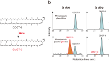 Cultures of M. maripaludis S001 transformants (100 mL) were incubated to stationary phase at 37 °C, harvested by centrifugation at 10,000 × g for 10 min, and pellets were stored at −80 °C before extraction. Frozen cell pellets were freeze-dried, and ~30 mg of dried mass was weighed and ground with a laboratory spatula. An internal standard, C46 GTGT (118 ng)59, was added to the ground pellets, before acid hydrolysis in 40 mL capped glass vials with 5 mL 10% hydrochloric acid (HCl) in methanol (MeOH) (vol/vol) at 70 °C overnight. In all, 10 mL of dichloromethane (DCM) and 10 mL of nanopure water were added to the acid-treated mixture, and lipids in the mixture was extracted with DCM for three times in a 50-mL Teflon tube. The samples were centrifuged for 10 min at 2800 × g to separate the aqueous and organic phases. The bottom organic phase layer was transferred to a collection glass vial. The organic phases were combined and filtered through a 0.45-μm PTFE filter and dried under N2 gas.