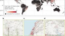Despite these strengths, some limitations and unaddressed issues in this research are noteworthy. First, we only examined how future urban expansion will directly affect terrestrial biodiversity without considering its indirect effects. Indeed, telecouplings40,41 through supply chains (e.g., global trade42, land grab43) and other human–nature interactions over distance can also cause land-use change9. Thus, land-use displacement (particularly cropland displacement) induced by urban expansion may cause natural habitat loss in other areas8, which further causes biodiversity loss in these other areas. Although it is currently difficult to accurately quantify such indirect effects of urban expansion, fine-scale trade-flows data (e.g., the world food trade) may facilitate us to indirectly analyze the embodied biodiversity loss. Future research may use environmentally extended input–output database and network analysis methods to measure these indirect effects. Second, due to limited technologies, the lack of some data makes it impossible to address some other potentially important questions. For instance, due to a lack of available future long-term and high-resolution global land cover change and land-systems simulation data, we could not accurately estimate the dynamic changes in habitat and biodiversity losses due to urban land conversion. Future research can address this issue by simulating future global land cover and land-systems change maps under the SSP framework. Meanwhile, because habitat fragmentation due to future urban expansion can threaten biodiversity, it is necessary to investigate the effects of habitat fragmentation caused by urban expansion on biodiversity degradation. However, because of the lack of global dynamic biodiversity data, we did not cover this aspect, although it is an important question proposed in previous research13. Third, we based our study on the global projections of urban expansion in previous research that used input data aggregated on 32 world regions17. Many of these macro-regions (e.g., EU15, LAM-H, and MEA-M) contain more than one country, which may lead to uncertainties in the future forecast of national-scale urban land demand and the specific locations of future urban land expansion. These uncertainties may affect the accuracy of our estimated impacts of future urban land expansion on biodiversity at the country and ecoregional levels. Nevertheless, we believe that future research can provide more accurate answers to these questions with the help of a more refined SSP database. Fourth, because urban expansion has occurred within protected areas in the past few decades19, we assumed that this trend of urban expansion within protected areas will continue without restrictions in the future. If we assume no urban development in protected areas, then by 2100, urban expansion within protected areas is expected to decrease by 16,111–59,306 km2 across SSP scenarios, which accounts for 4.59–8.02% of newly-added urban expansion between 2015 and 2100. Nevertheless, according to our model assumption, these urban areas will equivalently occur in other potential areas if they do not occur in protected areas. Thus, it is plausible that our work is subject to two caveats: (a) we may have overestimated the impacts of urban expansion on protected areas, especially on direct occupation, because the protected areas around the world vary in their enforcement effectiveness in preventing urban expansion and alleviating human pressure33,44. The enforcement effectiveness of protected areas depends on multiple factors, such as resources used to manage protected areas, law enforcement, and governance quality45. However, it is still difficult to accurately identify future enforcement effectiveness of protected areas, because protected area downgrading, downsizing, and degazettement (PADDD) are becoming increasingly prevalent in some developed countries (e.g., the United States)34. Even strictly protected areas (i.e., IUCN categories I and II) are subject to increasing human pressure, which suggests that the IUCN management category cannot inhibit the aggravation of human pressure46; (b) it should be noted that not all urban land within protected areas has negative consequences in an ecological sense, nor that all urban expansion in protected areas reflects a violation of the legal protection of protected areas. We should understand urban expansion in protected areas differently and seek potential solutions to sustain the harmonious coexistence of human and nature in the future. Finally, it is plausible that both urban expansion and biodiversity change may interact with future climate change, which we did not investigate in our study. For instance, urban expansion can accelerate climate change (particularly the change in urban microclimate)47, cause warming in urban and surrounding areas (urban heat island), and increase the intensity of precipitation and runoff in local areas48. Moreover, future climate change—such as more extreme weather events in urban areas and faster sea-level rise in most coastal urban areas48—can also affect urban development, urban environment, and urban expansion process49,50. In addition, climate change affects all aspects of life on Earth, perhaps with the most pervasive impact on species redistribution51, such as poleward and elevational range shifts51,52. Climate-driven changes in species redistribution, which may be more profound in the future when climate change intensifies, will affect global biodiversity patterns and shape new hotspots. Thus, future research on the effect of urban expansion on biodiversity needs to take into account the effect of climate change in this process.