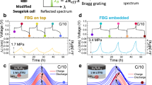 We minimised the compliance and dead volume of the fluidic connections to reduce the fluidic response time of the system during sample exchanges. The proximate end of the fibre is connected to a specially designed low-volume stainless-steel cell, covered by a sapphire optical access window (Edmund Optics), resulting in an internal volume of 230 nL. The cell is connected to an automated syringe pump (New Era Pump) actuating a 50 µL Hamilton syringe. The response time of the low-dead-volume microfluidic circuit was estimated to be 1–2 min and is currently limited by the internal volume of the syringe71. The geometry of the fibre embedded in the pouch cell is detailed in Supplementary Figs. 3–4 and 8. The microfluidic sampling line was assembled with Polyether ether ketone (PEEK) parts and Zero-Dead-Volume (ZDV) fittings (IDEX Health & Science, LLC, USA).